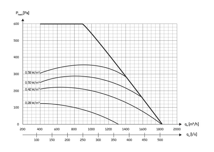 CapacityCapacity of standard unit as a function of qv and Pt ext. SFP values according to EN 13141-7 are for standard units with ISO ePM10 >60% (M5) filter in extract air, ISO ePM1 50% (F7) filter in fresh air and no heating element. SFP values comprise the unit´s total power comsumption incl. control. Attention! The SFP values are measured and stated as a total value for both fans. |