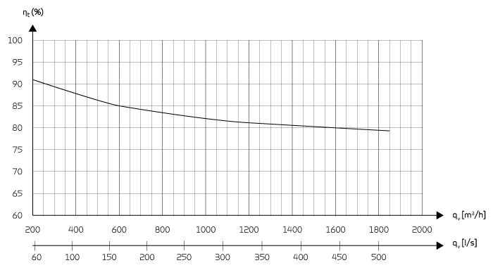 Temperature efficiencyTemperature efficiency for unit with counterflow heat exchanger according to EN308 (dry). Temperature efficiency EN308: ɳ t = (tsupply air-tfresh air)/(textract air-tfresh air) |