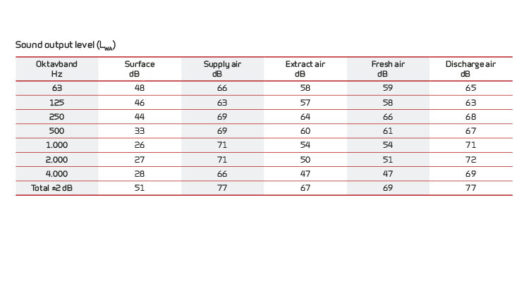 Sound dataSound data for qv = 1200 m3/h and Pt ext = 250 Pa according to EN 9614-2 for surfaces and EN 5136 for ducts. Sound output level LWA drops with falling air volume and falling back pressure. Sound output level LpA at a given distance will depend on acoustic conditions in the place of installation. |