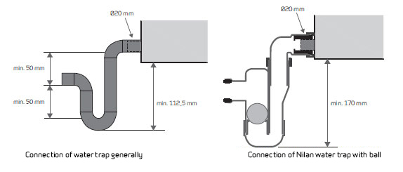 The unit makes little noise and produces only weak vibrations, but you should still take into account potential vibrations that can spread from the unit to individual building components. In order to separate the unit from its foundation, it is therefore recommended that you install vibration absorbers under the unit. There should be approx. 10 mm distance to other building components and to permanent fixtures. Condensate drainATTENTION! You MUST install a water trap in connection with the condensate drain to ensure that condensate water can drain away. If you set up the unit outside the climate screen, it is important to use a heating cable to prevent the condensate drain from icing up. Frost protection of the unit is the installer's responsibility.