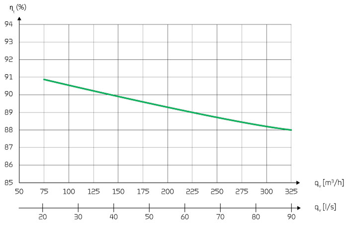 Temperature efficiency for units with counterflow heat exchanger according to EN13141-7 (dry).