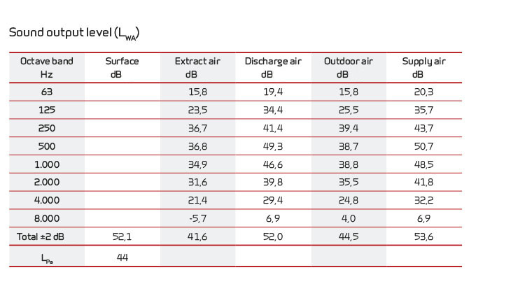 Sound data for qv = 126 m3/h and Pt ext = 100 Pa according to EN 3744 for surfaces and EN 5136 for ducts.