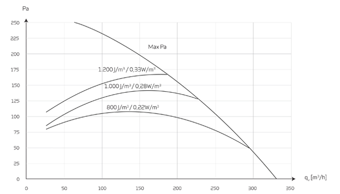 CapacityCapacity of standard unit as a function of qv and Pt ext SEL values according to EN 13141-7 are for standard units with ISO Coarse >75% (G4) filters and without heating element. SEL values represent the unit’s total power comsumption for both ventilator, excl. control. Testet according to EN13141-7 Attention! The SEL values are measured and stated as a total value for both fans. |