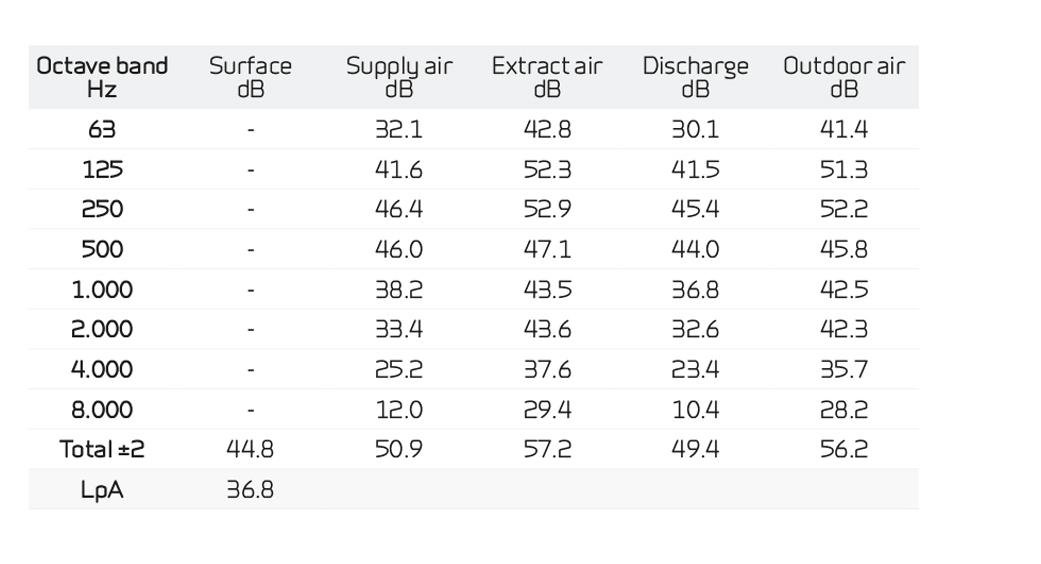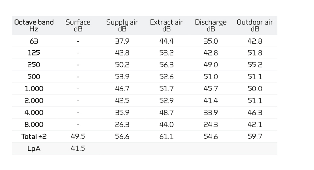 Sound dataSound data for qv = 126 m3/h and Pt ext = 100 Pa according to EN3744 for surfaces and EN 5136 for ducts. Sound output level LWA drops with falling air volume and falling back pressure. Sound pressure level LpA at a distance of 1 m from the system. |
