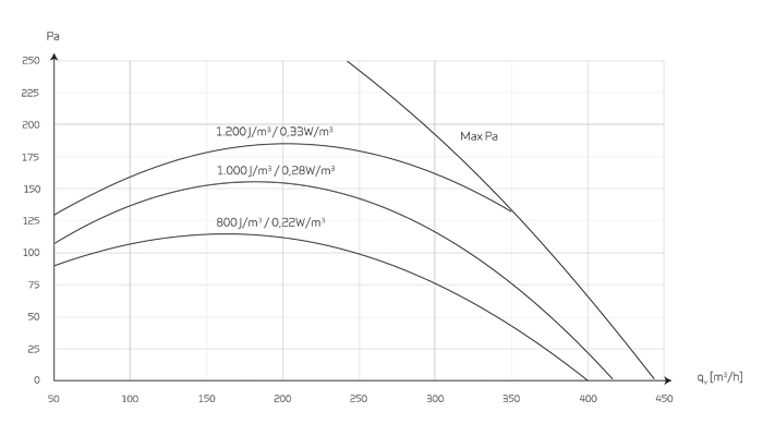 CapacityCapacity of standard unit as a function of qv and Pt ext SEL values according to EN 13141-7 are for standard units with ISO 16890 Coarse 75% (G4) filters and without heating element. SEL values represent the unit’s total power comsumption for both ventilator, excl. control. Testet according to EN13141-7 Attention! The SEL values are measured and stated as a total value for both fans. |