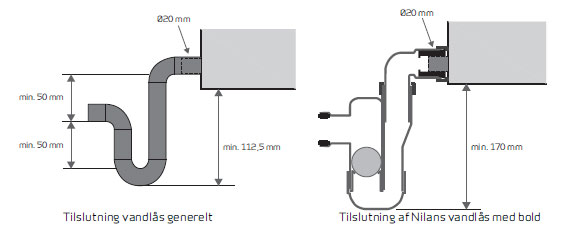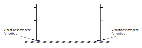 Aggregatet er støj- og vibrationssvag, men der bør alligevel tages højde for eventuelle vibrationer, der kan forplante sig fra aggregatet ud i de enkelte bygningsdele. For at skabe adskillelse mellem aggregat og underlag, anbefales det derfor at montere vibrationsdæmpere under aggregatet. Til øvrige bygningsdele og fast inventar bør der være ca. 10 mm afstand. KondensvandsafløbOBS! Der skal etableres vandlås i forbindelse med kondensafløbet for at sikre, at kondensvandet kan bortledes. Opstilles aggregatet uden for klimaskærmen, er det vigtigt, at sikre kondensvandsafløbet mod tilisning med et varmekabel. Det er installatørens ansvar at frostsikre afløbet.
