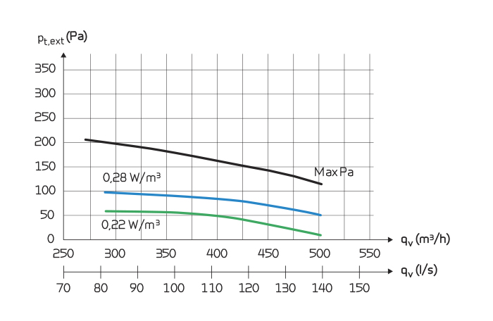 CapacityCapacity of standard unit as a function of qv and Pt ext SEL values according to EN 13141-7 are for standard units with ISO 16890 Coarse 75% (G4) filters and without heating element. SEL values comprise the unit´s total power comsumption incl. control. Attention! The SEL values are measured and stated as a total value for both fans. |