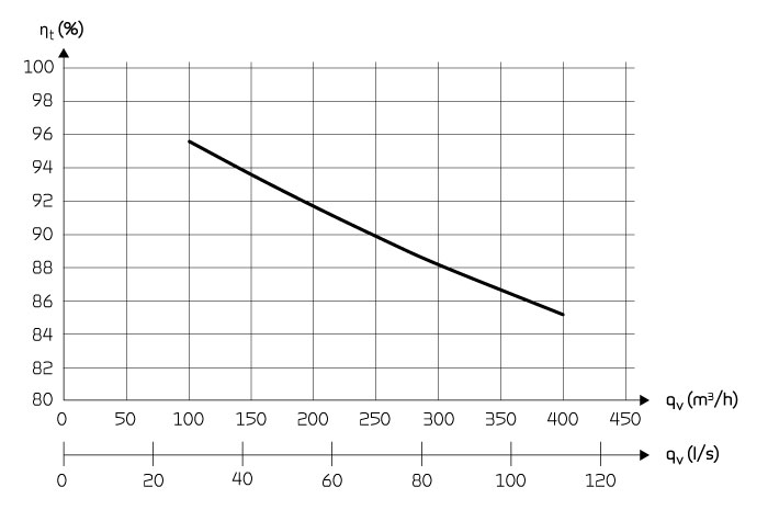 Temperature efficiencyTemperature efficiency for units with counterflow heat exchanger according to EN13141-7 (dry). |