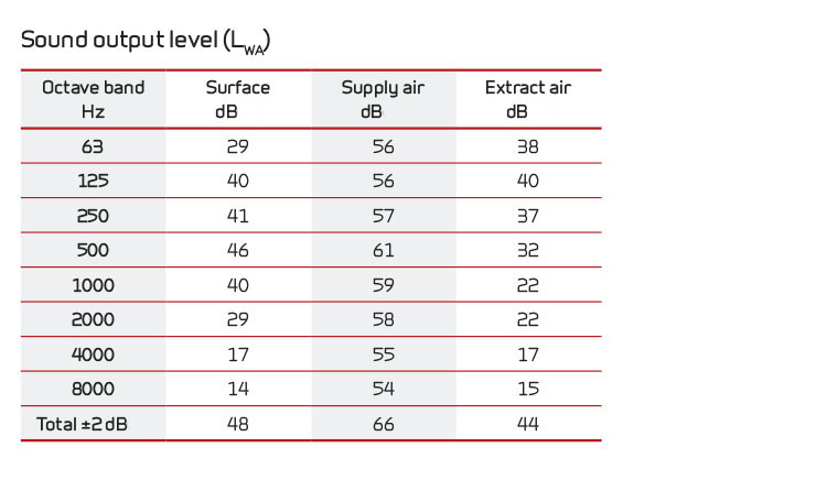 Sound dataSound data for qv = 300 m3/h and Pt ext = 100 Pa according to EN 9614-2 for surfaces and EN 5136 for ducts. Sound output level LWA drops with falling air volume and falling back pressure. Sound output level LpA at a given distance will depend on acoustic conditions in the place of installation. |