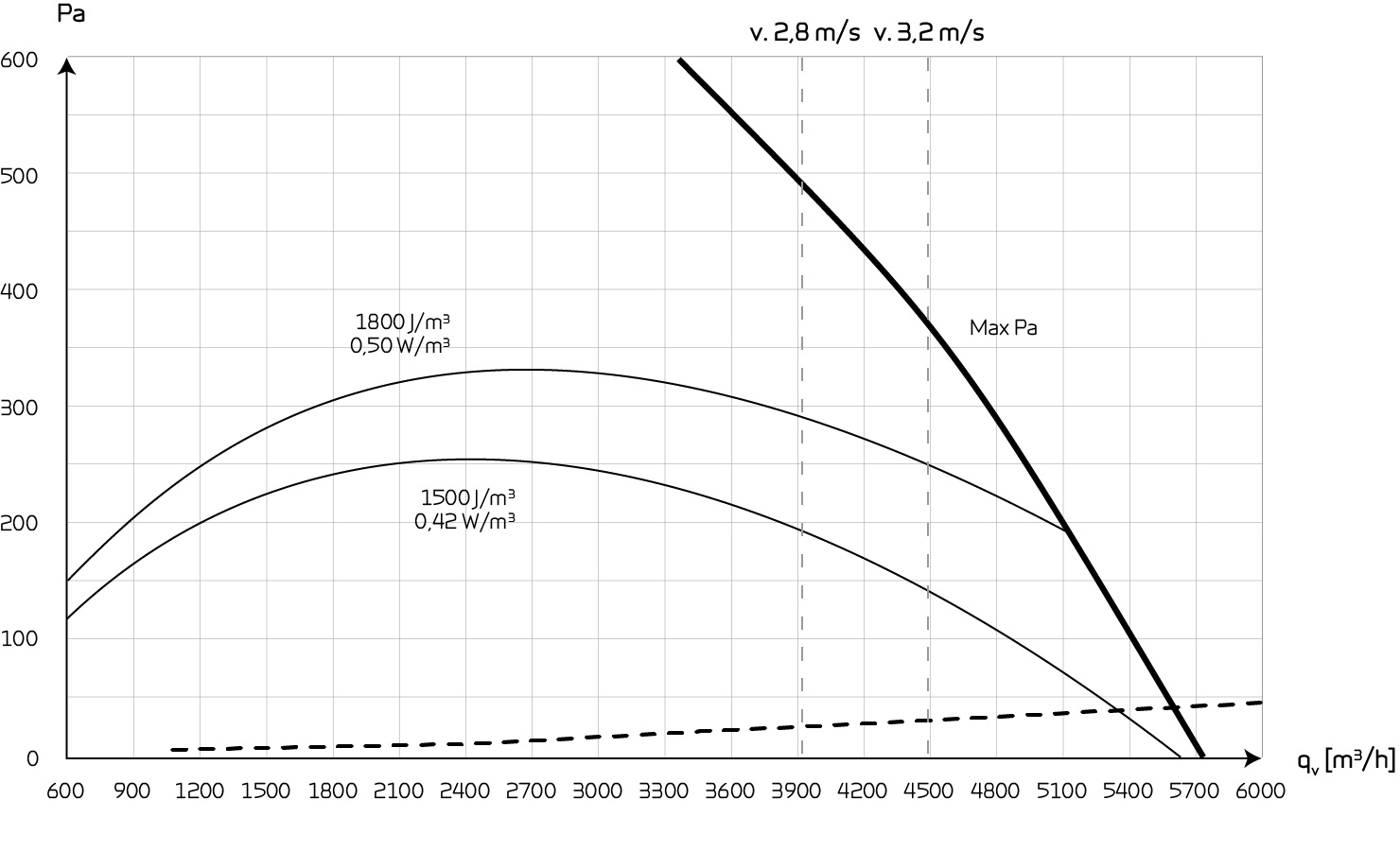 Capacity (condensation exchanger)The following design data is calculated on the basis of a condensation exchanger. Max Pa capacity of standard unit, Pt,ext as a function of qv, with regard to SFP-values. SFP-values according to EN13053 for a standard unit with ISO ePM10 >60% (M5) & ISO ePM1 50% (F7) filters an no heating element. * Airflow speed above evaporator is measured at meters per second. Attention! The SFP values are measured and stated as a total value for both fans. |