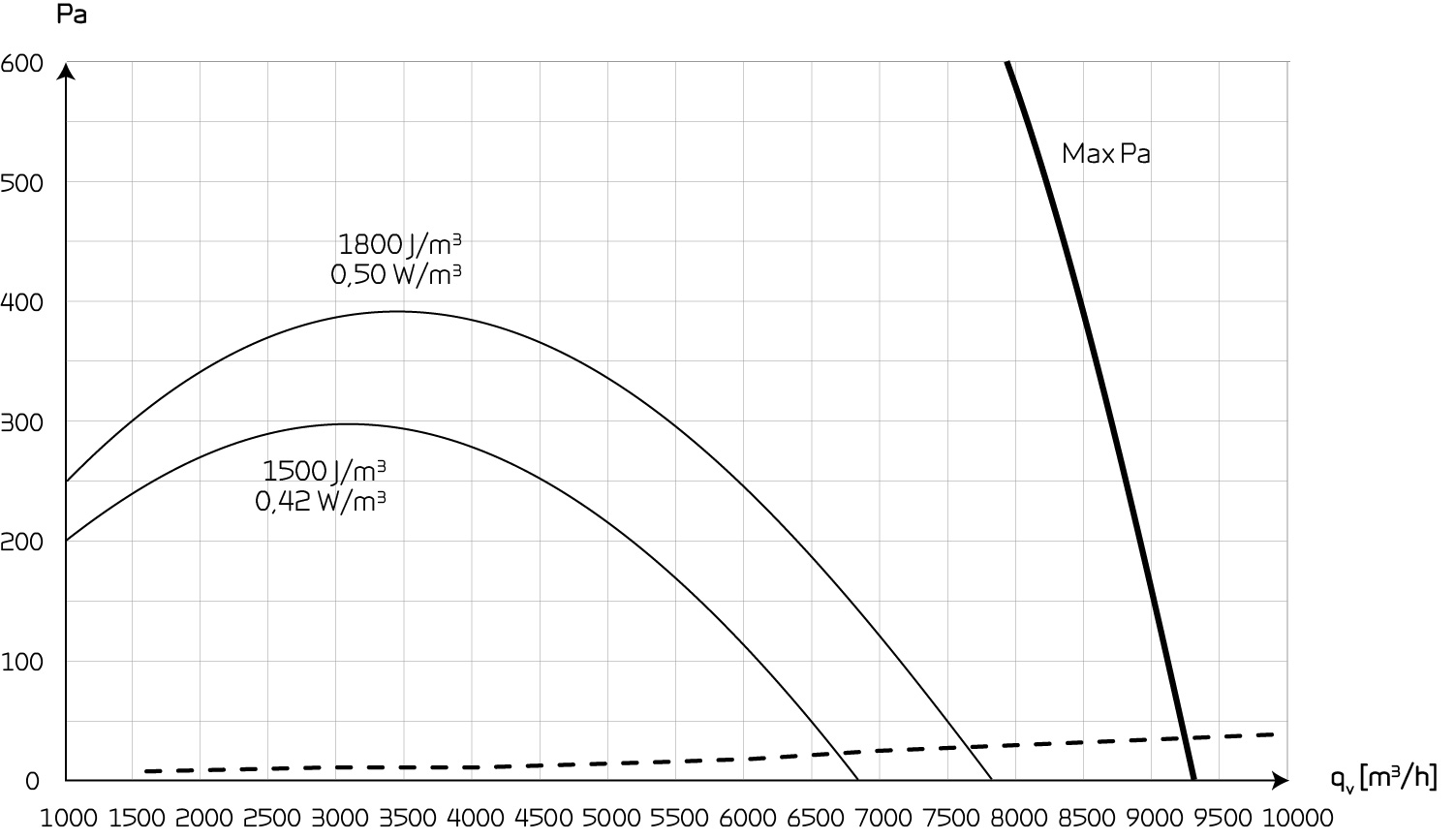 Capacity (condensation exchanger)The following design data is calculated on the basis of a condensation exchanger. Max Pa capacity of standard unit, Pt,ext as a function of qv, with regard to SFP-values. SFP-values according to EN13053 for a standard unit with ISO ePM10 >60% (M5) & ISO ePM1 50% (F7) filters an no heating element. Attention! The SFP values are measured and stated as a total value for both fans. |