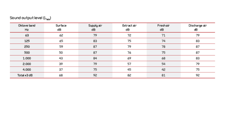 Sound dataSound data for qV = 10,000 m3/h and Pt, ext = 250 Pa according to EN 9614-2 for surfaces and EN 5136 for ducts. Sound output level LWA drops with falling air volume and falling back pressure. Sound output level LpA at a given distance will depend on acoustic conditions in the place of installation. |