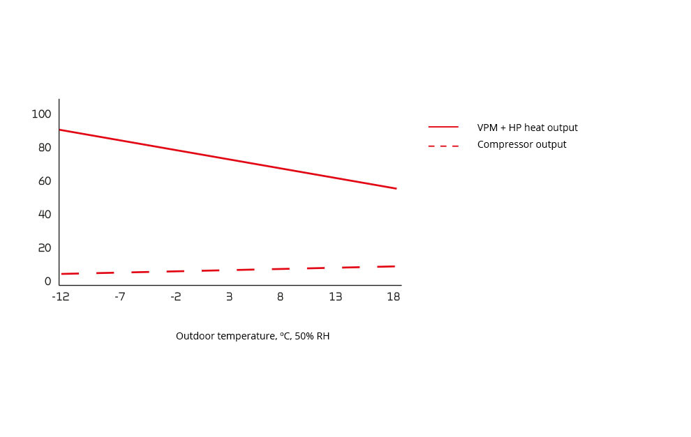 VPM 1000 is a ventilation unit with heat recovery via a reversible heat pump that can both cool and heat the supply air. The integral heat pipe increases both the cooling and the heating effect and it therefore ensures a good COP.