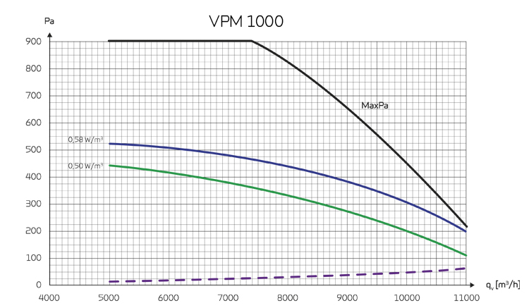 CapacityMax Pa capacity of standard unit, Pt,ext as a function of qv, with regard to SFP-values. SFP-values according to EN13053 for a standard unit with ISO ePM10 >60% (M5) & ISO ePM1 50% (F7) filters an no heating element. Attention! The SFP values are measured and stated as a total value for both fans. |