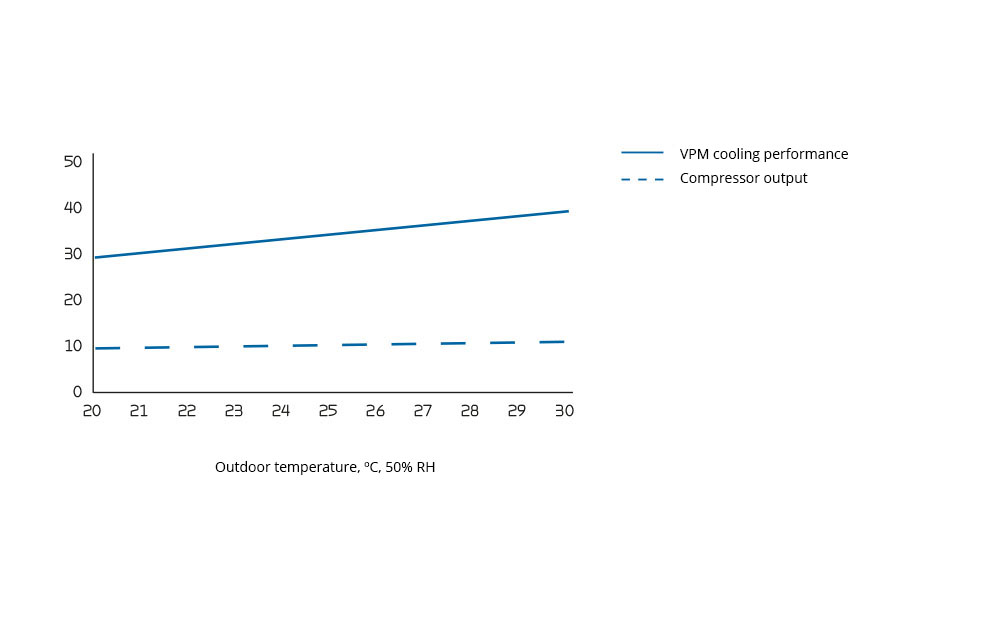VPM 800 is a ventilation unit with heat recovery via a reversible heat pump that can both cool and heat the supply air. The integral heat pipe increases both the cooling and the heating effect and it therefore ensures a good COP.