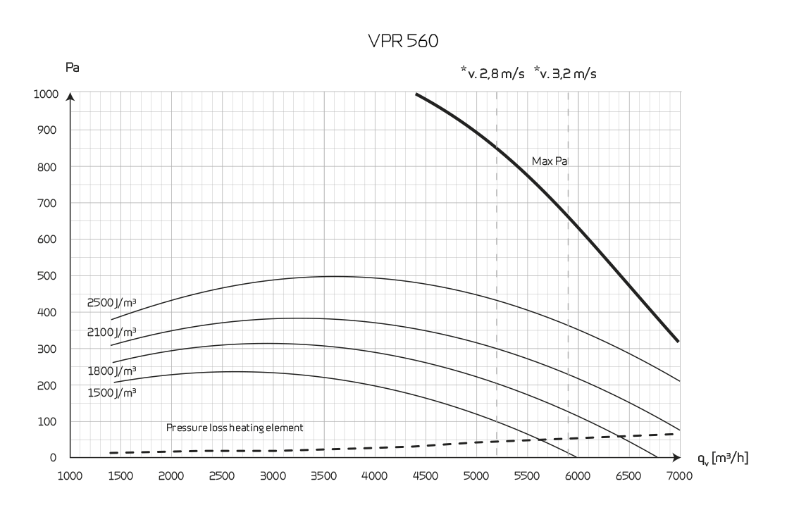 Capacity (sorption exchanger)The following design data is calculated on the basis of a sorption exchanger. Max Pa capacity of standard unit, Pt,ext as a function of qv, with regard to SFP-values. SFP-values according to EN1353 for a standard unit with ISO ePM10 >60% (M5) & ISO ePM1 50% (F7) filters and no heating element. * Airflow speed above evaporator is measured at meters per second. Attention! The SFP values are measured and stated as a total value for both fans. |
