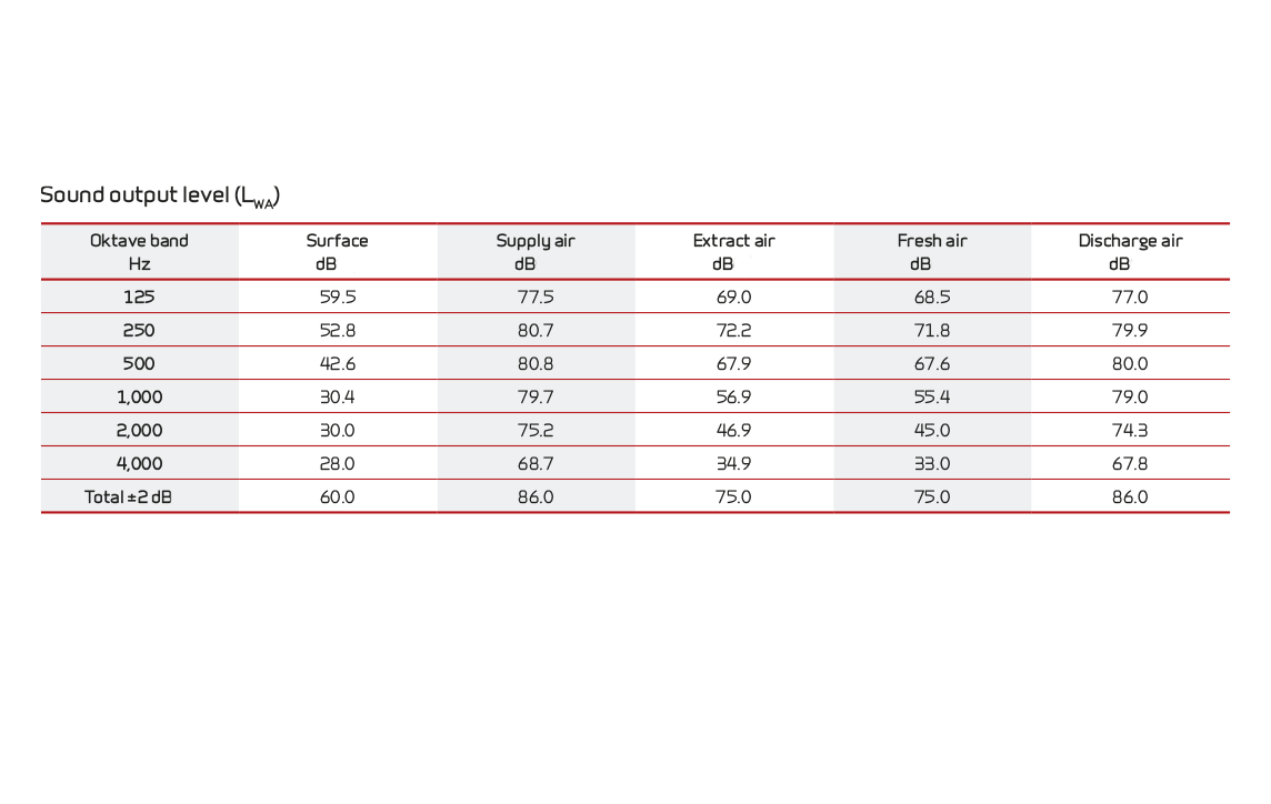 Sound dataSound data for qV = 5600 m3/h and Pt, ext = 250 Pa according to EN 9614-2 for surfaces and EN 5136 for ducts. Sound output level LWA drops with falling air volume and falling back pressure. Sound output level LpA at a given distance will depend on acoustic conditions in the place of installation. |