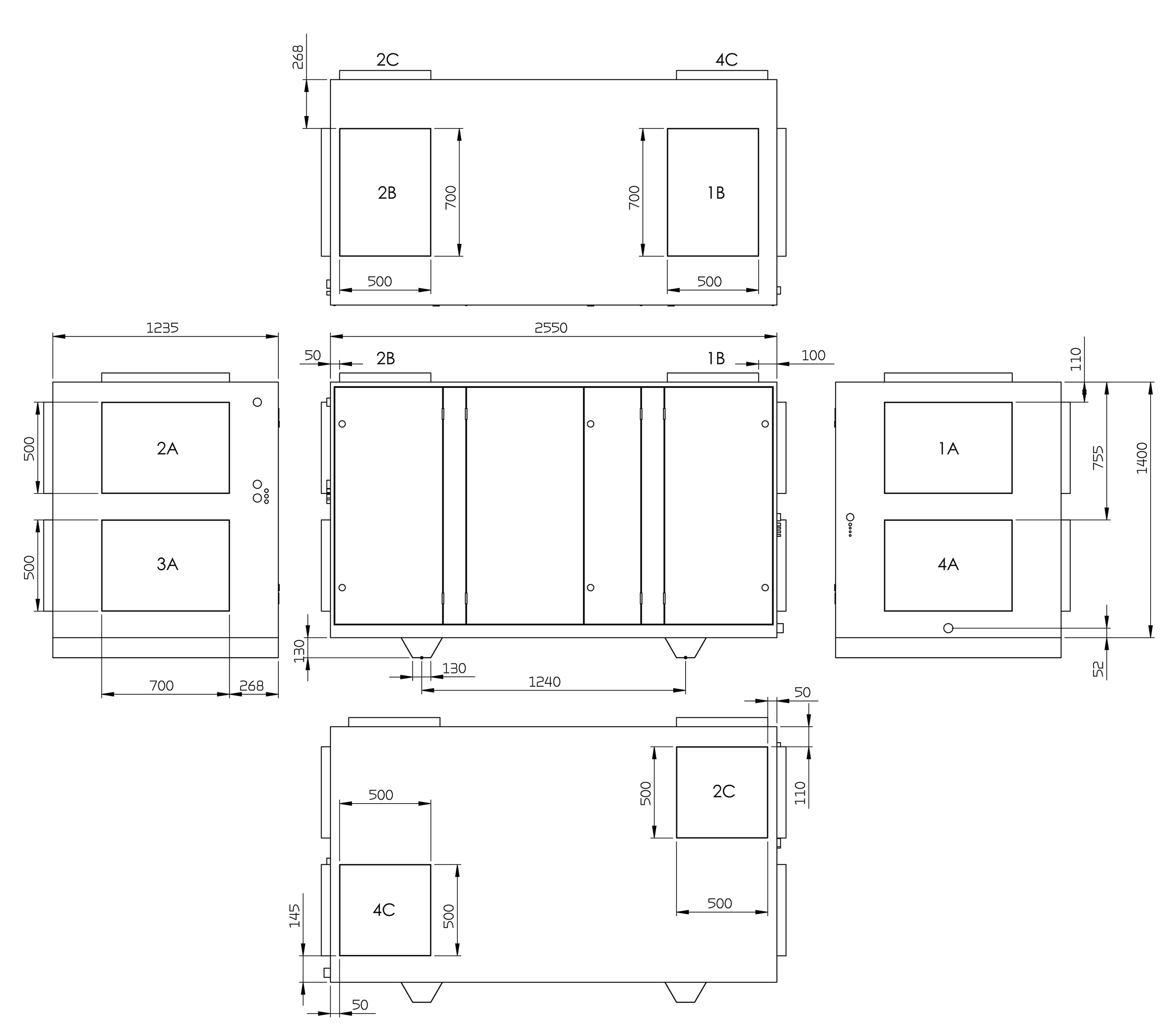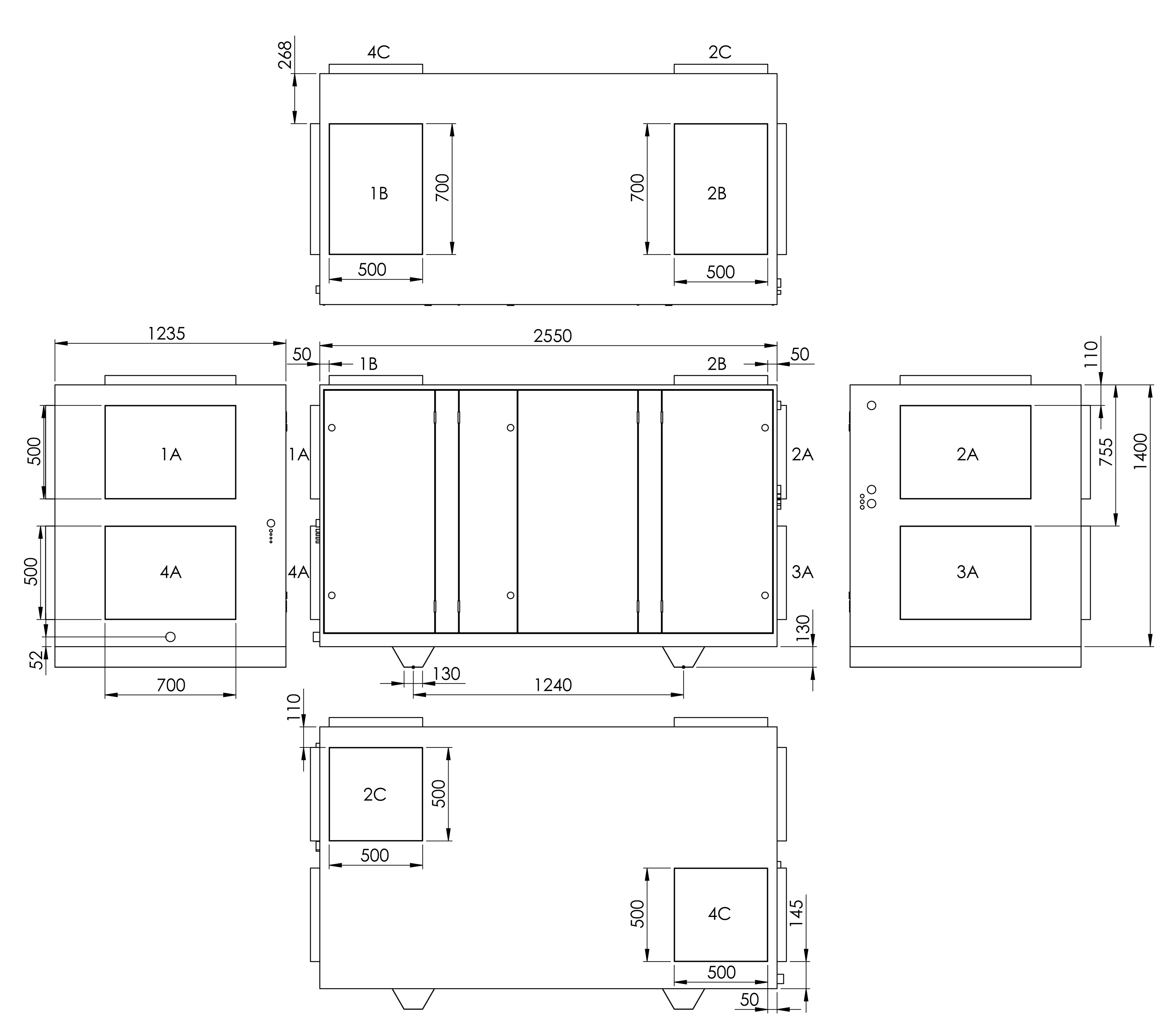 All dimensions are shown in mm. 1. Outdoor air A. Gable location Dimensional drawing VPR 560 (Right version):